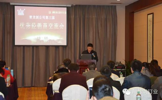公司董事長馬志華對全國經銷商的到來表示誠摯的感謝。——“感謝各位經銷商來參加2016年度青龍劍公司第三屆優秀經銷商交流會,歡聚一堂共同探討青龍劍釘業發展大計”。