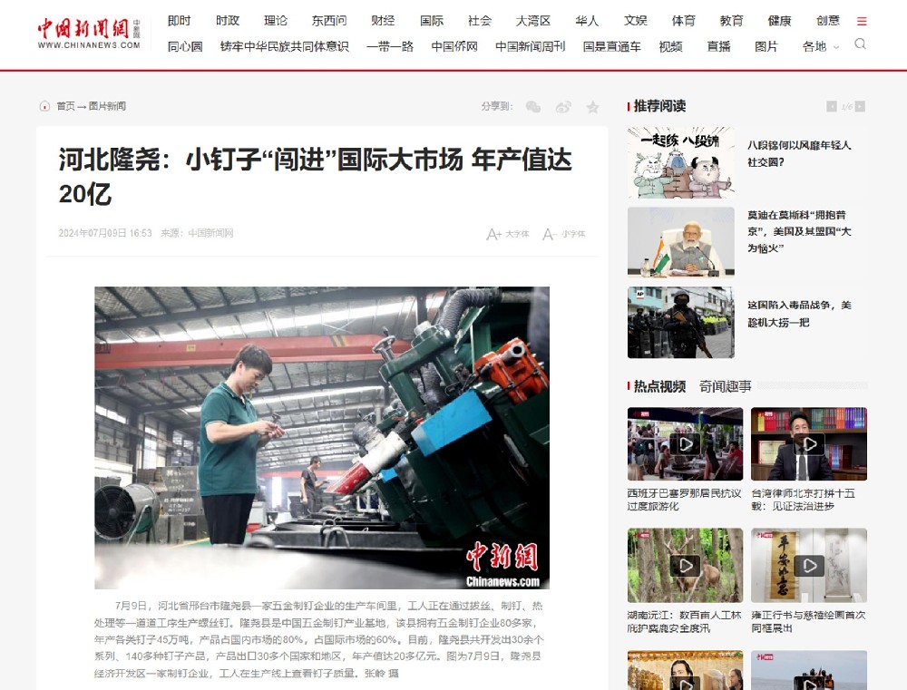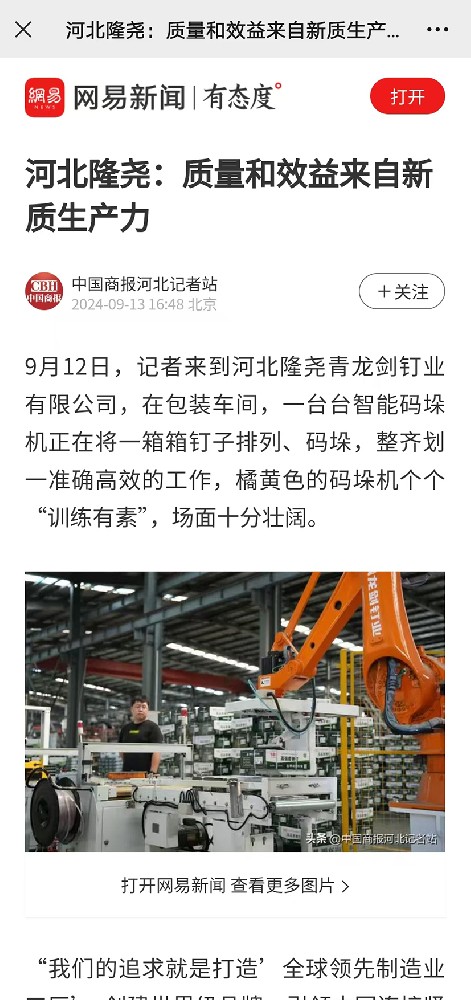 近日,中國(guó)新聞網(wǎng)記者走進(jìn)河北隆堯青龍劍釘業(yè)有限公司,對(duì)制釘車間的生產(chǎn)工序及車間環(huán)境進(jìn)行了解和拍攝。7月9日下午,青龍劍釘業(yè)榮登中國(guó)新聞網(wǎng)。青龍劍釘業(yè)將不斷探索、研發(fā)產(chǎn)品,通過技術(shù)升級(jí)、產(chǎn)品創(chuàng)新,為社會(huì)提供更高效、更安全緊固產(chǎn)品,提供更全面的基材連接緊固系統(tǒng)解決方案,樹立行業(yè)標(biāo)桿,助力國(guó)家建設(shè)![詳情] 2024-07-19 14:26:03